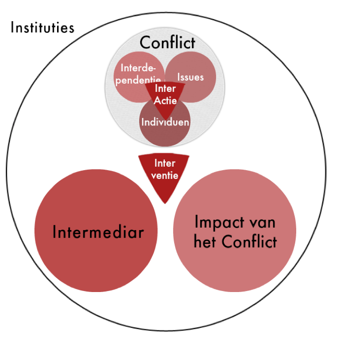 Conflicten stoten af en slokken op. Voor buitenstaanders vaak de reden om er bij uit de buurt te blijven. Voor conflictpartijen is het naar mate het conflict verder escaleert steeds moeilijker om er letterlijk en figuurlijk uit te komen. Iemand die er buiten staat (intermediair) kan dan een belangrijke rol spelen. Die kan van een afstand kijken naar het conflict en naar een mogelijke oplossing. Hij of zij kan met een open blik onderzoeken wie bij het conflict betrokken zijn (individuen), hoe ze met elkaar omgaan (interactie), hoe ze van elkaar afhankelijk zijn (interdependentie), waar het conflict over gaat (issues), wat de impact ervan op de organisatie en elkaar is en in welk type omgeving het conflict zich afspeelt (instituties). In die analyse wordt het conflict helder. Daarin ligt de basis voor de oplossing.